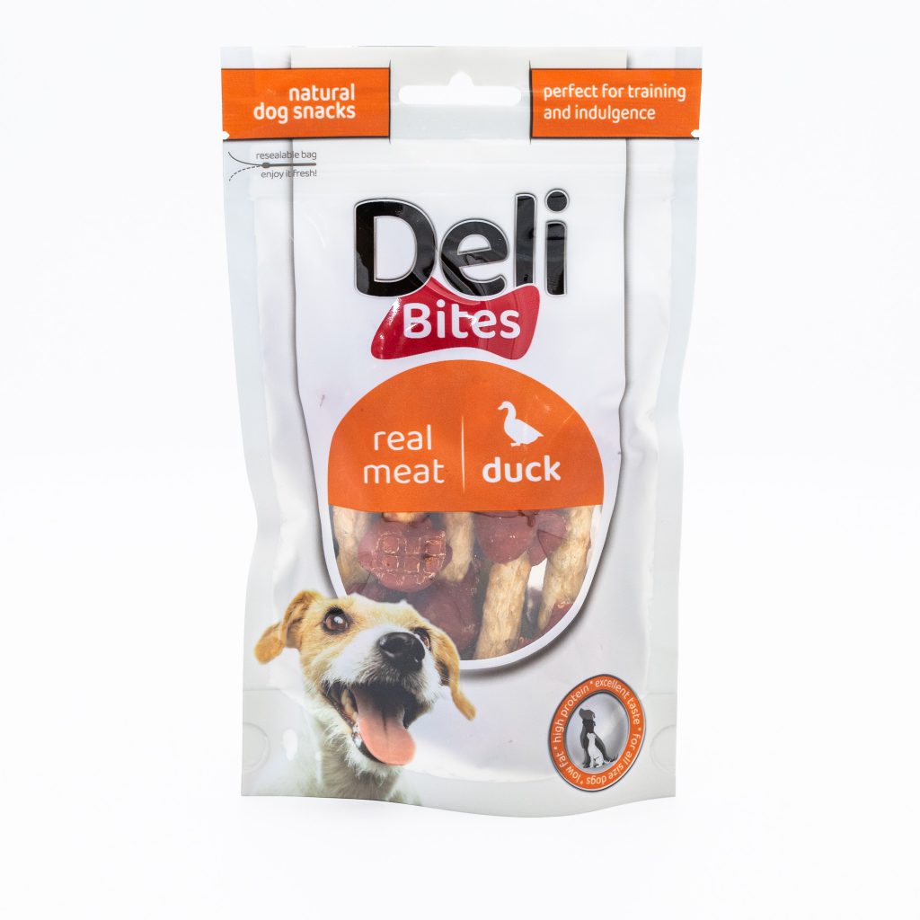 מרכיבים: ברווז 56%, עור גולמי 28%, קמח אורז 3%, חלבון צמחי 5%, קמח חיטה 3%, גליצרין 3%, סורביטול 1.5%, מלח 0.4%, עשלגן סורבט 0.1%